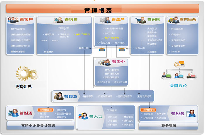 主要实现业务过程的全面管理,突出对关键流程的控制,体现了事前计划、事中控制、事后分析的管理思想,以加强企业核心业务流程运作规范化为第一目标。涵 盖企业财务、供应链、生产管理等核心应用,并全面集成HR人力资源管理、CRM客户关系管理、PDM图文档管理、BI领导决策分析系统、协同办公等应用, 提供企业物流、资金流、信息流和知识流相结合的企业管理工具。实现人、财、物、供、产、销的全面结合、全面受控、实时反馈。以流程式管理,实现企业订单的 快速响应、减少库存积压、确保及时交货、降低赊销风险、完善内控体系,是普遍适应成长型小企业的ERP解决方案。