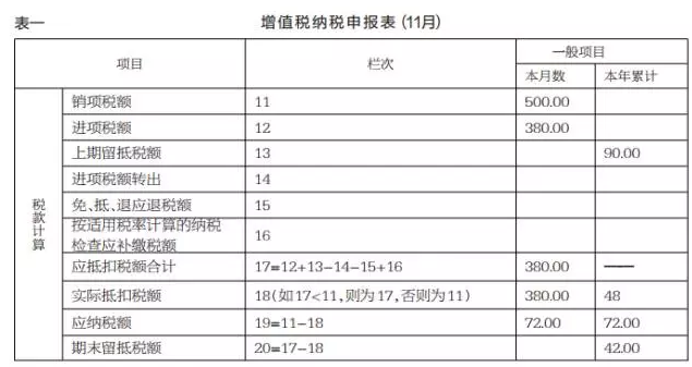 1.按原申报规则计算税款所属期11月份的应纳税额为72万元,“期末留抵税额”“本年累计”栏次的余额为42万元: