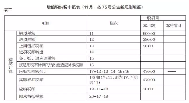 2.按75号公告确定的新申报规则计算税款所属期11月份的应纳税额为30万元,“期末留抵税额”本年累计余额为0元: